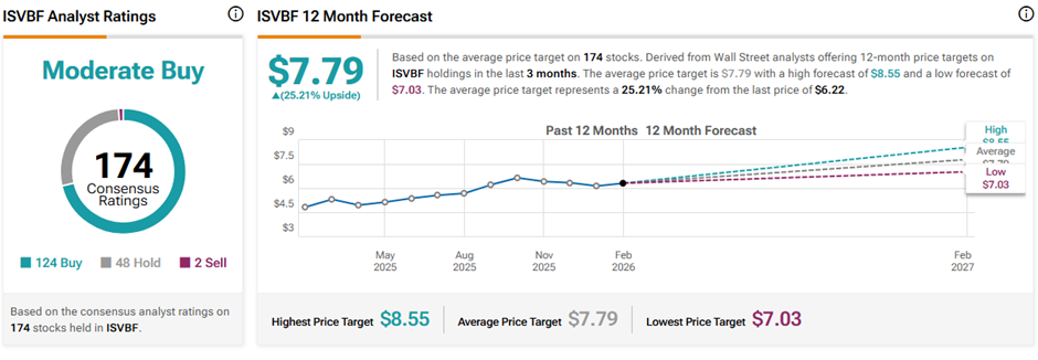 根据TipRanks的ETF分析师共识(基于对其持仓评级的加权平均),ISVBF被评为适度买入。市场的平均目标价为7.78美元,意味着上涨空间为25.2%。