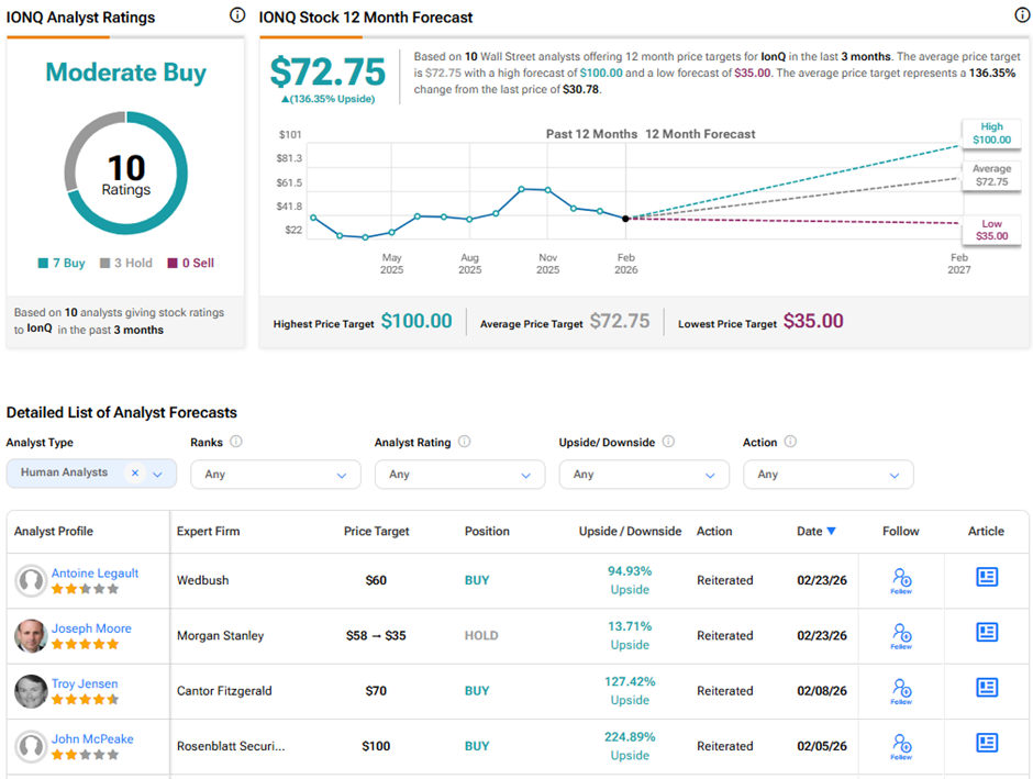 分析师对IonQ的长期前景仍持谨慎乐观态度。在TipRanks上,IonQ获得“适度买入”共识评级,基于7个买入和3个持有评级。IonQ的平均目标价为72.75美元,意味着从当前水平上涨136%的潜力。在过去一年中,IONQ股价下跌了1.5%。