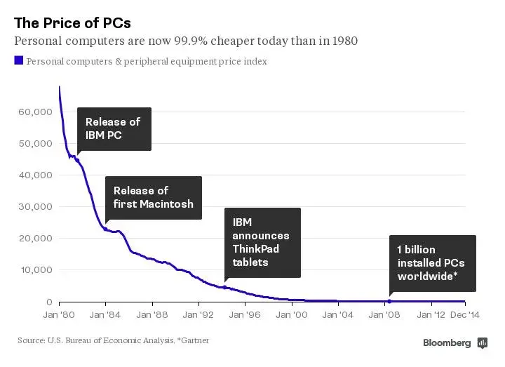 这假设了一个静态的经济。历史表明,当生产成本下降时,需求通常会扩张。计算机的价格比 1980 年便宜了 99.9% ,但我们并没有仅仅消耗同样数量的计算能力——我们消耗的数量呈指数级增长。