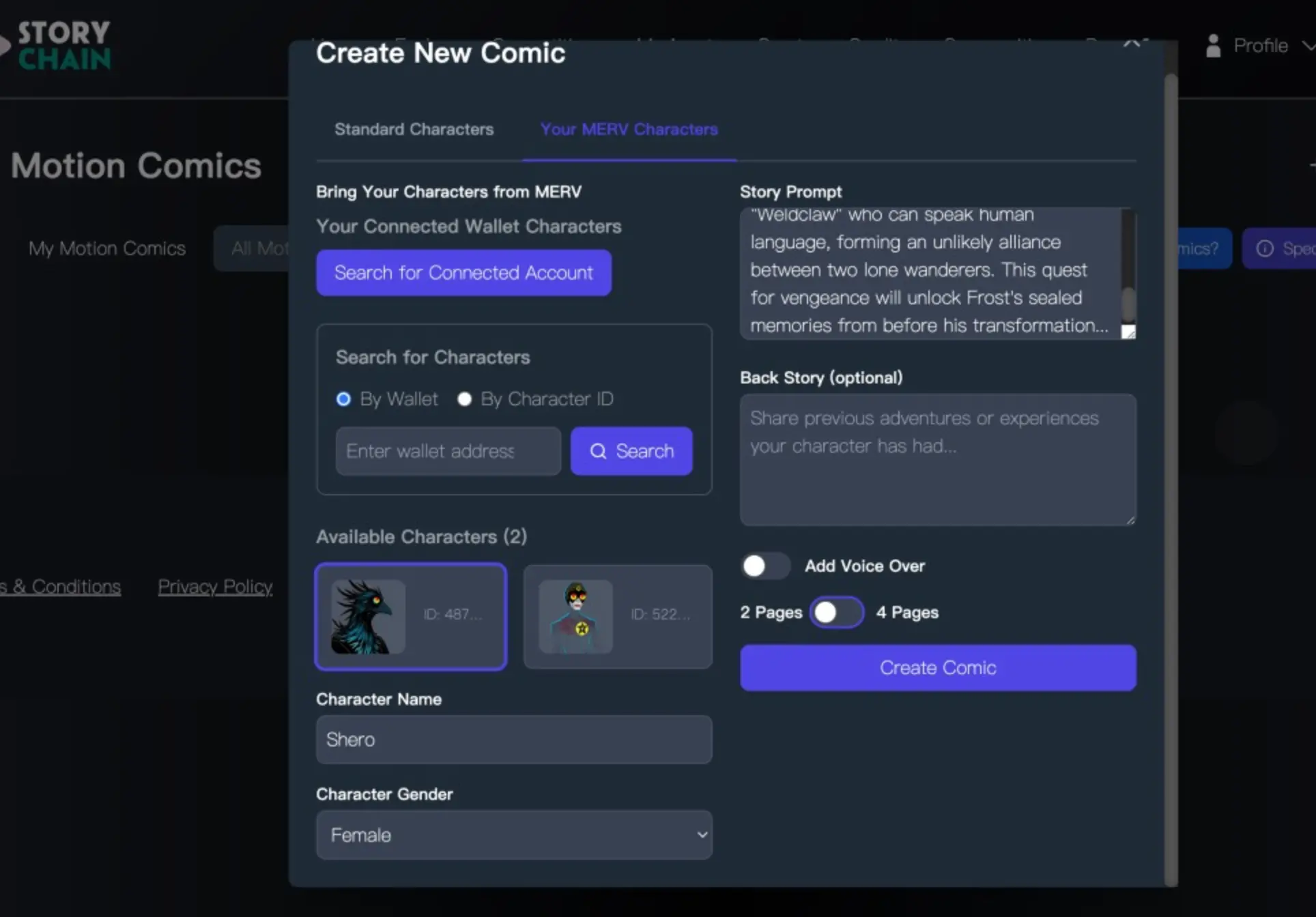 6、点击"Bring to life on Storychain",跳转到 https://storychain.ai/comicbook,准备为角色创作剧情。