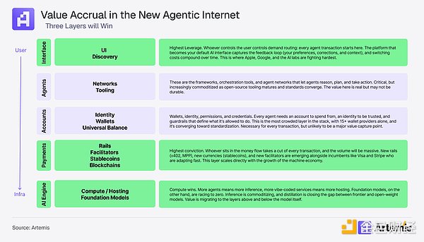 价值将集中在三大层级:界面层,掌控用户交互的主体;支付层,介入资金流转的主体;算力与托管层,运营基础设施的主体