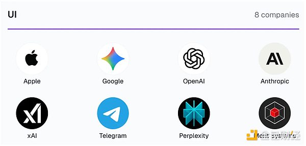 这是大多数人与智能代理直接交互的入口。苹果、谷歌、OpenAI、Anthropic、xAI 以及 Perplexity 都在打造这类交互界面,其形态正快速跳出单纯的聊天模式。语音助手、桌面端助手、嵌入式副驾驶、浏览器代理等新形式不断涌现,贴近用户的真实使用场景。成为用户默认 AI 界面的平台,将成为代理发起所有交易的起点,这一赛道的胜出者将获得额外的巨大优势。