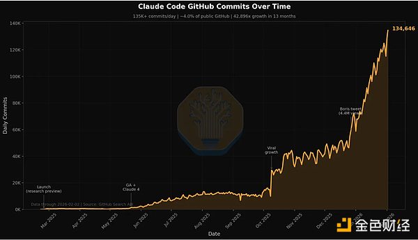 唯一的障碍是信任,而信任建立的速度远超人们预期。目前 Claude Code 已贡献 GitHub 上全部公共代码提交量的 4%(每日超 13.5 万次),按当前增速预计,2026 年底将突破 20%。这意味着 13 个月内实现了42896 倍增长。开发者们仅用一年多时间,就从怀疑转向大规模将生产级代码交由 AI 完成。