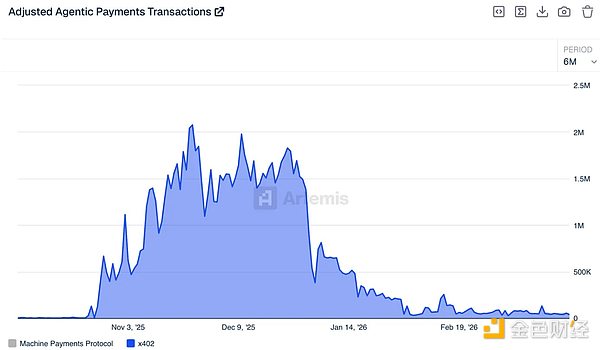 2025 年末的 x402 协议交易量,受到模因币炒作与排行榜刷量行为的虚高影响。上图为经过专有算法过滤虚假交易后,调整得出的 “真实” 交易活跃度。剔除掉虚假交易与模因币炒作带来的噪音后可以明显看出,代理经济尚未真正到来。当前大部分活动只是开发者在测试付费 API 与 AI 工具,而非真正的代理经济体在运转。