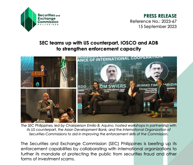 菲律宾 SEC 主席埃米利奥·B·阿基诺 (Emilio B. Aquino) 表示,此次研讨会旨在“加强菲律宾 SEC 执法人员对内幕交易、市场操纵、场外欺诈和加密货币诈骗等证券相关犯罪进行调查的能力。”