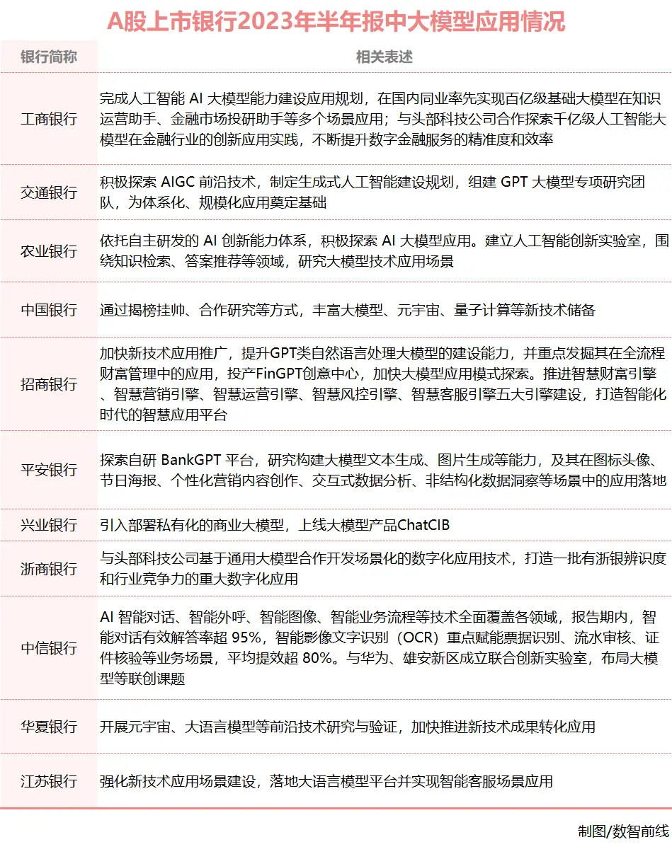 一个更新的趋势是,不少金融机构都已将大模型从战略层面重视起来。据不完全统计,A股上市公司中,至少有工商银行、农业银行、中国银行、交通银行等11家银行,都已在最新半年报中明确提出正在探索大模型的应用。从近期动作看,他们也正在从战略层面和顶层设计层面有更清晰的思考和路径规划。