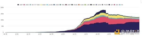 链上稳定币发行规模 来源:The Block、Coin Metrics、DeFillama