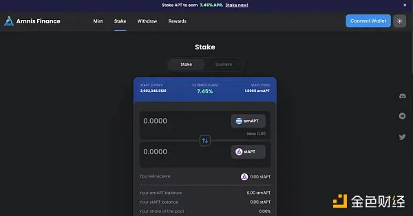 Amnis Finance 质押页面 来源:Amnis Finance 官网