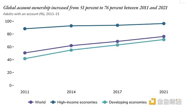 2021 年全球拥有银行账户人口占比 来源:世界银行数据库