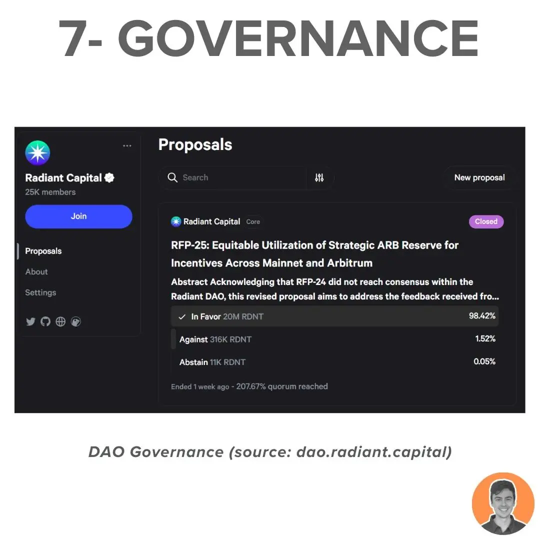 Radiant Capital 作为 DAO 运作,在治理论坛上拥有 25,000 名成员,迄今为止对 25 项提案进行了投票。要参与这些提案的投票流程,需要锁定您的 RDNT 代币。
