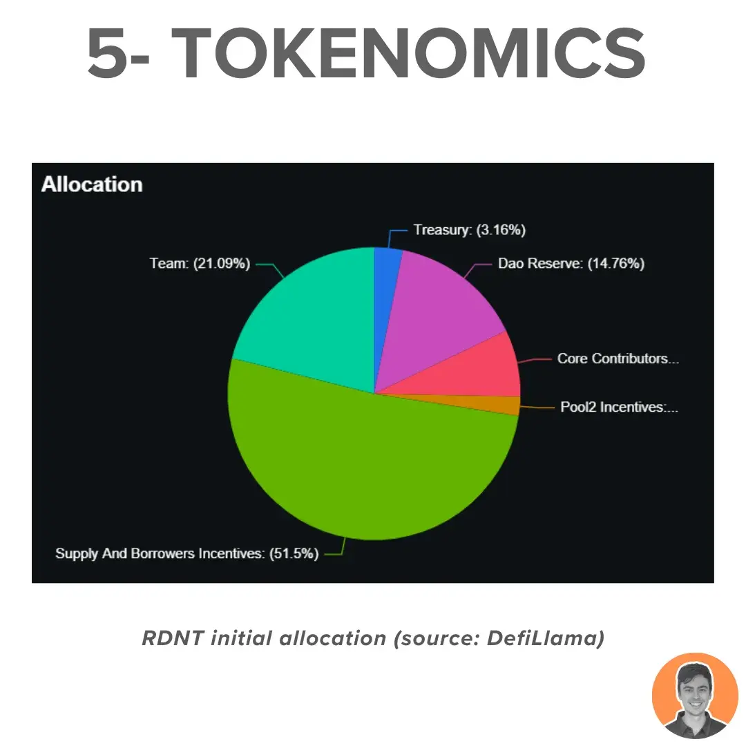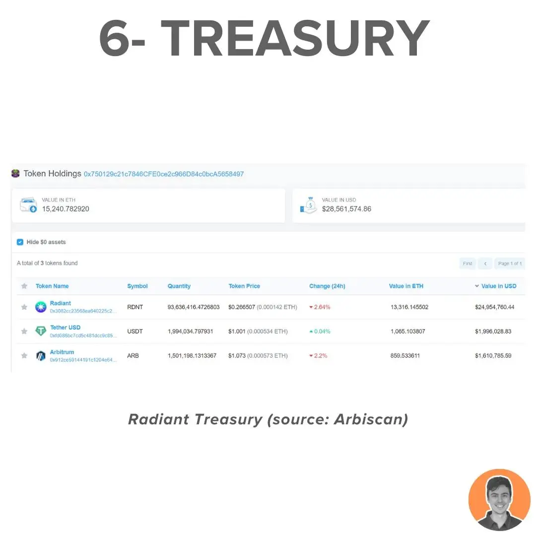 DAO 储备资金,并有权决定 RDNT 的发行分配方案。国库资金则用于日常运营开支(如工资、上市、营销等)。