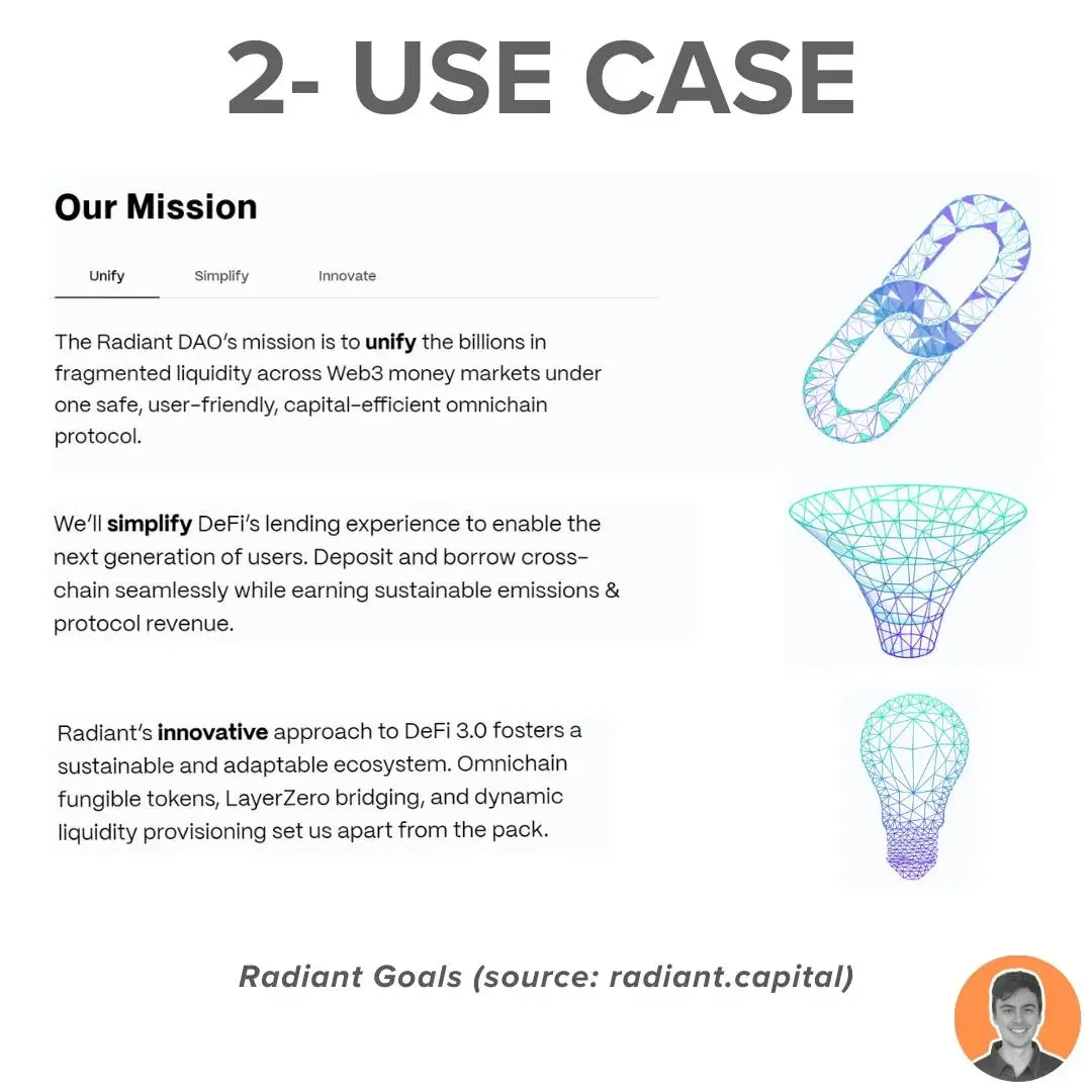 DeFi 的一个主要问题是流动性分散。借款人必须选择一条链,而他们提取的资产必须存在于同一条链上。在不同链之间桥接可能会很麻烦且风险较高。所以 Radiant 的目标是: