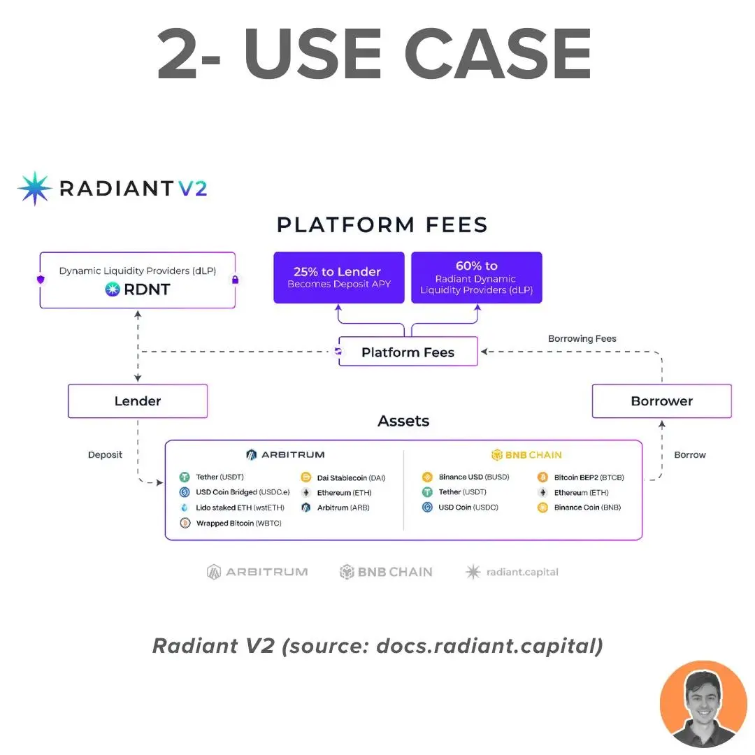 $RDNT 是 Radiant 的原生实用代币(OFT-20)。LayerZero 的全链解决方案实现了链上无缝代币转移。$RDNT 支持协议费用分享,并通过锁定的 dLP 提供治理。
