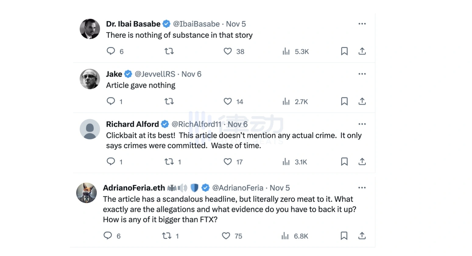 但在这些质疑和指控推文的评论区中,大部分社区用户持观望态度,他们普遍的声音是 Nerayoff 并没有给出实质性证据,靠推测和捕风捉影无法影响以太坊的地位,「这篇文章的标题令人震惊,但实际上内容为零。这些指控到底是什么?你有什么证据支持它?它怎么比 FTX 还要大呢?」
