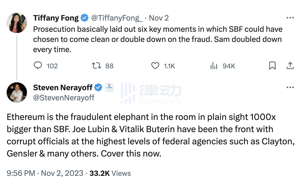 11 月 2 日,在加密 KOL Tiffany Fong 的一则关于 SBF 审判相关内容的推文下方,以太坊前顾问 Steven Nerayoff 评论到,「显而易见,以太坊是房间里的大象,甚至让 FTX 案黯然失色。Joe Lubin 和 Vitalik Buterin 一直是联邦机构最高层那些腐败官员的前线,比如 Clayton(前 SEC 主席)、Gensler(SEC 主席)等。」