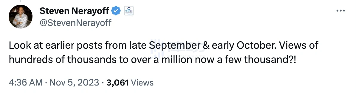 几个月过去,社区也没能见到 Steven Nerayoff 给出的实质性指控。而 Nerayoff 甚至在最近的推文里称 Twitter 对他进行了流量限制(banned & tags),「查看九月底和十月初的早期帖子,浏览量几十万到上百万现在几千?!」