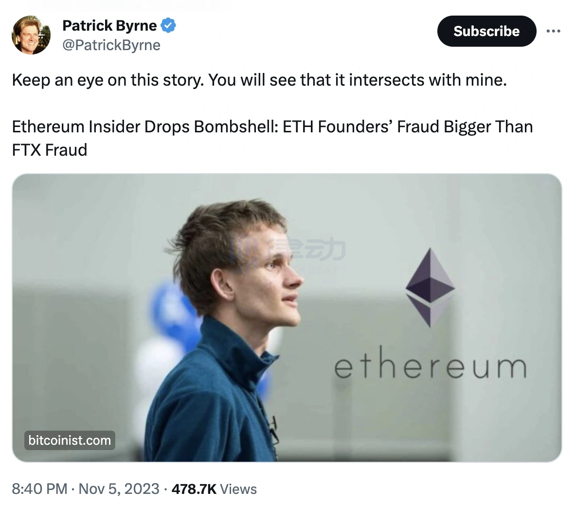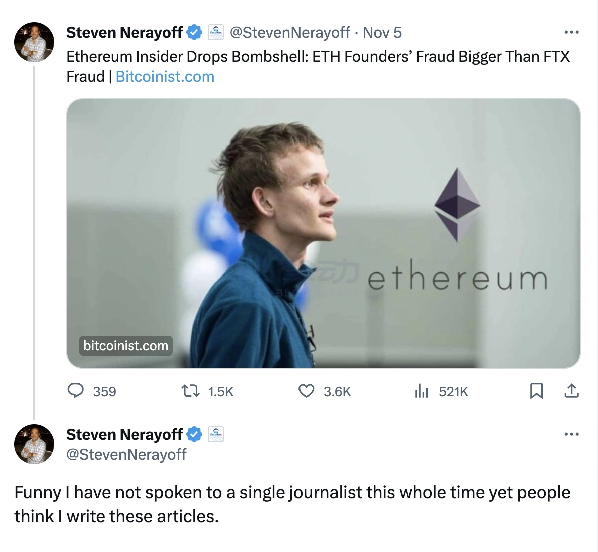 随后,加密媒体 Bitcoinist 发布了一篇名为《以太坊 Insider 爆出重磅炸弹:ETH 创始人的欺诈比 FTX 欺诈还要严重》的文章引发社区关注。