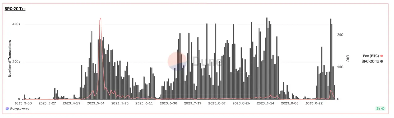 两个月后,一个名为 domo 的神秘工程师发布了 BRC-20,向社区宣告,比特币生态也可以实现发币自由。本质上讲 BRC-20 还是以 Ordinals 协议为基础,通过向网络部署 JSON 文件自定义代币供应、发型限额等代币的基本条件, 以 BRC-20 为标准铸造的代币可以在钱包间自由转移。虽然说上文将 BRC-20 和 Ordinals 与以太坊链上的 ERC 标准类比。但最重要的不同在于比特币网络上基于 Ordinals 创造的小图片和代币直接铭刻在单个聪上,由于比特币本身的特性直接「经典咏流传」。至此,关于比特币生态扩展的讨论再次被推向顶峰,BRC-20 交易量也在近一个月之后达到了近 40 万之多,然而在急速攀升的交易量背后不可忽视的是高达 255BTC 的当日总交易费用。