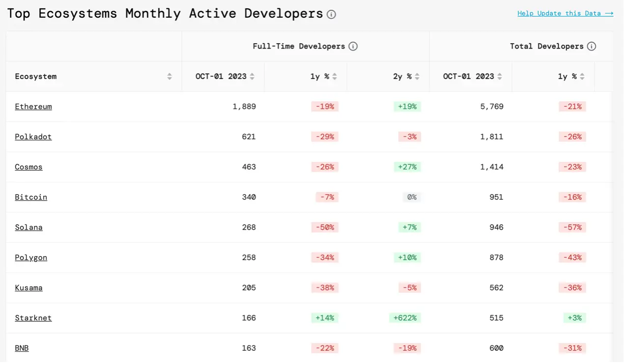与此同时,比特币在加密圈子的日子也不好过。冲着套期保值来的投机者发现比特币失去了熊市对冲能力、几乎沦为风险资产时直呼「退钱」。比特币曾被视作「神之一手」的图灵完备和共识效应等先天条件似乎也渐渐成了限制其功能迭代的藩篱——比特币社区中的大多数「中本聪信徒」抱着 15 年前的白皮书拒绝革新,生态链上几乎没部署任何智能合约,比特币本身除了价值贮藏别无长物,开发者也逐渐流向能提供「情绪价值」的以太坊。根据 Electric Capital 统计的开发者数据,当前比特币生态月活开发者仅有 1291 名,而以太坊则是其近六倍之多,单全职开发者就有 1889 名。