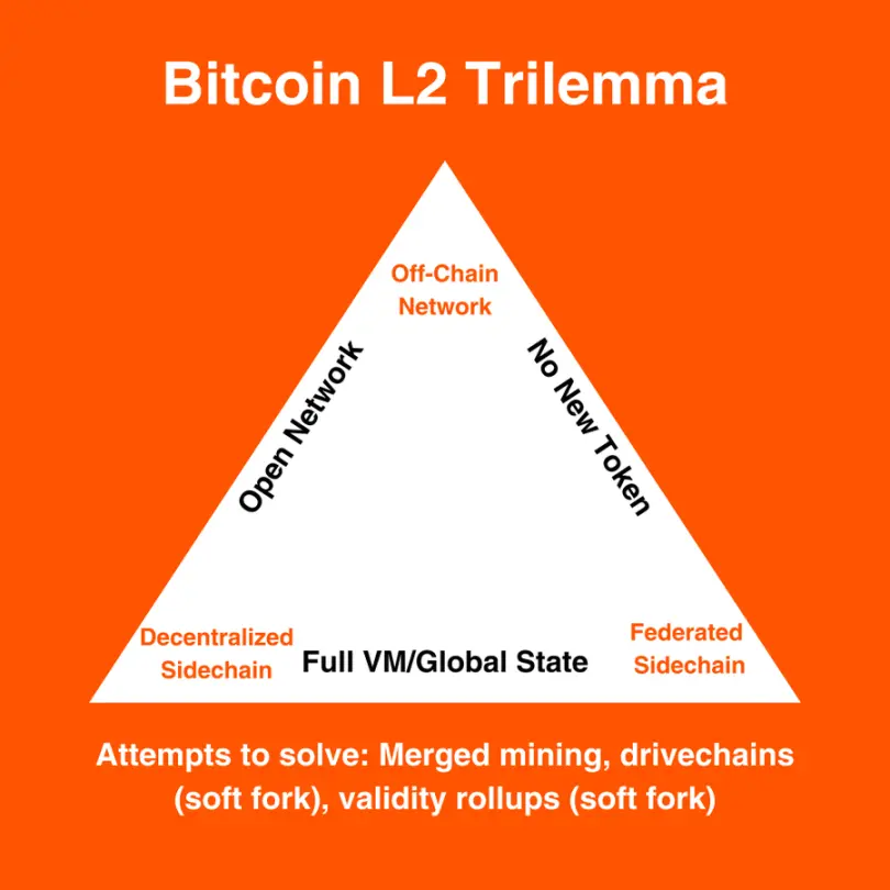 而比特币的二层们,作为三边战争的重要一环,也面临着「不可能三角」的难题