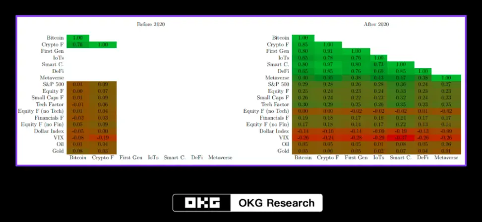 比特币等加密资产作为小众资产虽然在 2020 年之后与例如 S&P500 和全球海外发达国家股票市场等金融市场的相关联性越来越强。我们可以看到在全球主要股票市场(Equity F)的关联性上,是可以看出之前的 0 关联变成了 0.25,仅低于 S&P500 的相关性 0.29。在金融因素(Financials F)的关联性上,从 -0.03 变为 0.19。