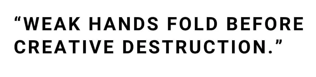 资本蒸发,弱者退出:投资、公司、项目、散户投资者,没有承诺的人离开,从而产生一种整合效应。我爸爸将这个过程称为「创造性毁灭」,因为尽管这很难受,但它会导致真正为世界(以及投资者)创造价值的竞争对手,而第一阶段的上升(泡沫)仅与资本市场如何为投机泡沫创造空间有关。