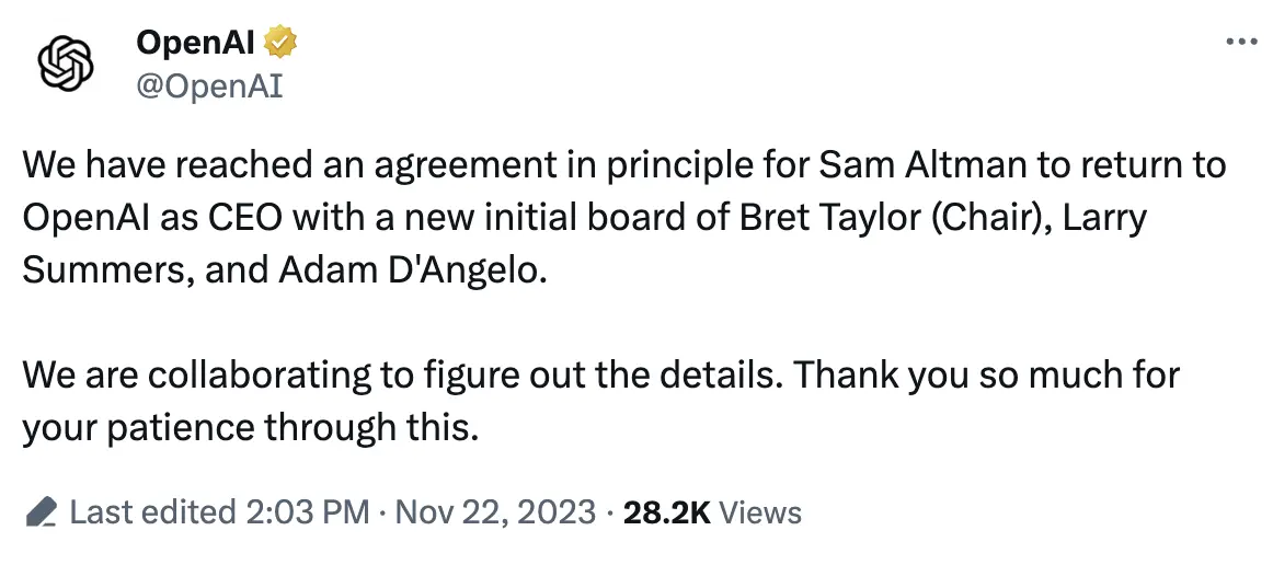 AI 新智界讯,OpenAI 刚刚在社交平台 X 上宣布,已经达成原则性协议,Sam Altman 将回归 OpenAI 担任首席执行官,并与 Bret Taylor(主席)、Larry Summers 和 Adam D’angelo 组成新的初始董事会。并称正在合作解决细节问题。