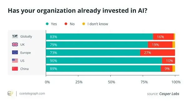 在中国,人工智能与区块链技术的结合似乎尤其受到青睐。在Casper Lab的调查中,68%的中国IT受访者同意“人工智能和区块链技术的融合有可能彻底改变我们的行业,从而提高数据的安全性、透明度和效率”。相比之下,这一比例在美国为48%,在欧洲仅为34%。