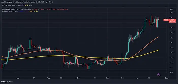 日线图上加密货币总市值即将达到 1.4 万亿美元大关。