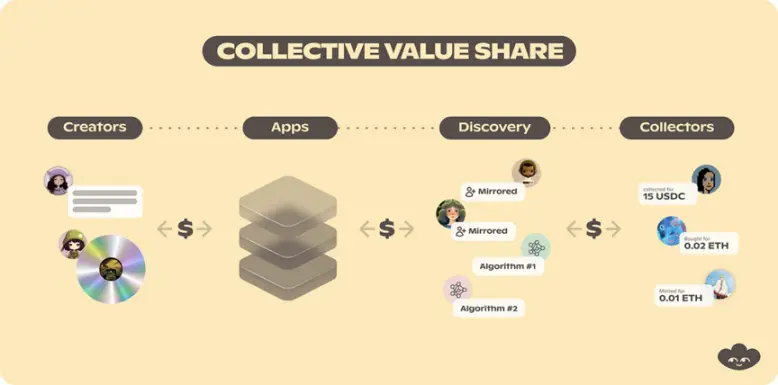 在这个过程中,内容原创者、内容推广者(策展人)以及平台都可以参与内容收益。原创用户无需自己推广或在其他平台重复发布,就能享受到多个平台的收益。而策展人的角色变得非常重要,他们负责将用户原创的内容推广给更多的人或在其他平台上发布,同时也能分享其中的收益。这样形成了一种收益分层的机制。