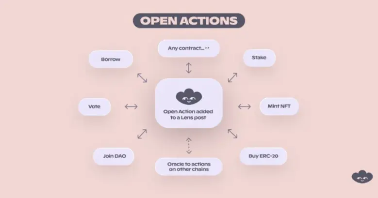 Lens V2 引入了开放操作(Open Actions)功能,进一步增强了社交网络的可组合性,为用户和开发人员提供更多自由度和创造力。开放操作提供了一个开放的框架,允许开发人员直接在 Lens 中集成外部智能合约操作,从而在社交网络中创造出创新的体验。
