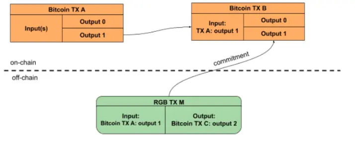 RGB 的基础层是比特币区块链,包括 Nakamoto PoW 共识和交易账本。虽然不需要在链上存储任何数据,但仍需要遵循现有的基础设施,并利用比特币交易作为这些承诺的存储。