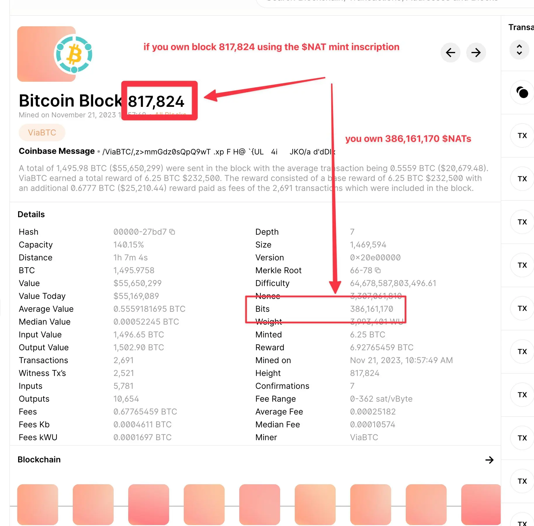 举个例子,如果用户将 NAT 写入了区块 817, 824 ,那么就会获得 386, 161, 170 枚 NAT 代币。而如果用户拥有 817, 824.bitmap,那么同样也可以铭刻 386, 161, 170 枚 BMT 代币。