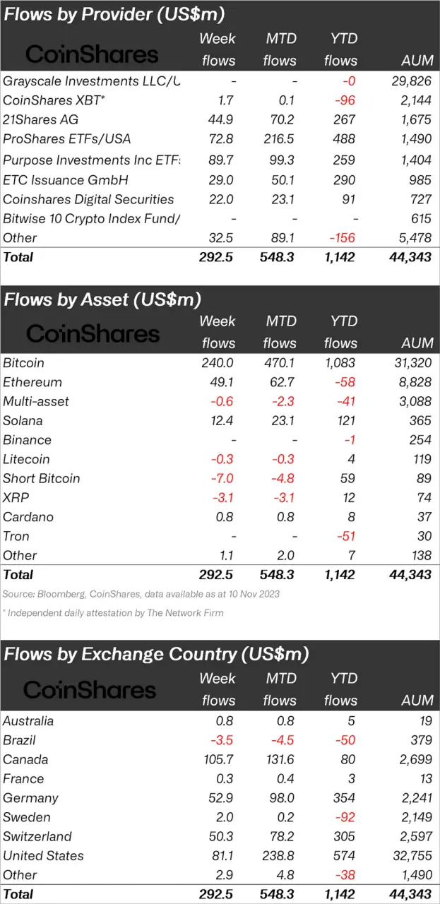 CoinShares 在 11 月 13 日发布了最新周报*,强调了资金重新流入比特币和山寨币的叙事。随着美国首个 ETF 可能获得批准的兴奋情绪升温,比特币、以太坊和部分主要山寨币正在经历价格上涨。