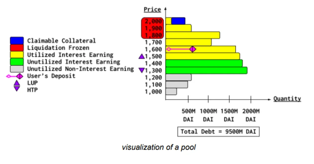 贷方首先选择他们愿意借出代币(例如 USDC)的抵押品(例如 ETH)估值。借款人从最高估值向下匹配。贷款风险最高(贷款与抵押品比率最高)的借款人设定「最高门槛价格」(HTP),估值较低的贷款人不会获得利息。