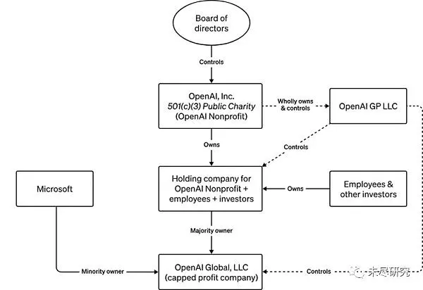 后来,因为包括马斯克等人承诺的10亿美元资金,仅到位1亿多美元,先进算力与一流人才的成本巨大,公司研究与运营难以为继,决定成立一家盈利性质的子公司OpenAI Global LLC,它由非盈利的OpenAI 完全控制。